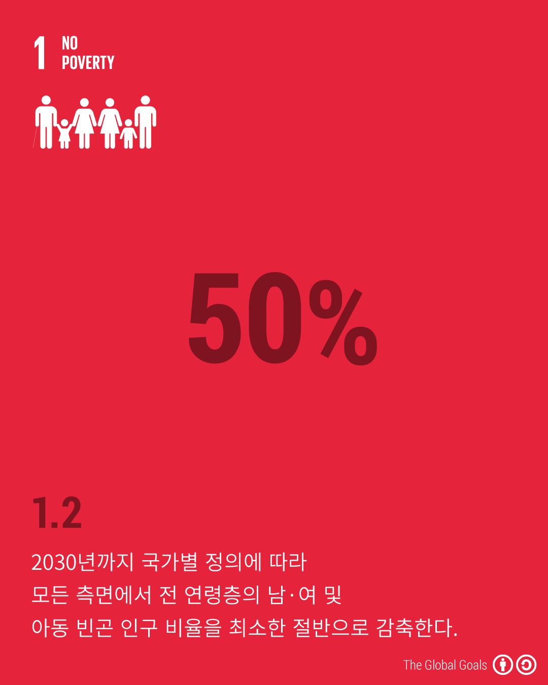 - 1.2 - 2030년까지, 국가별 정의에 따라 모든 측면에서 전 연령층의 남녀 및 아동의 빈곤 인구 비율을 최소한 절반으로 줄인다.