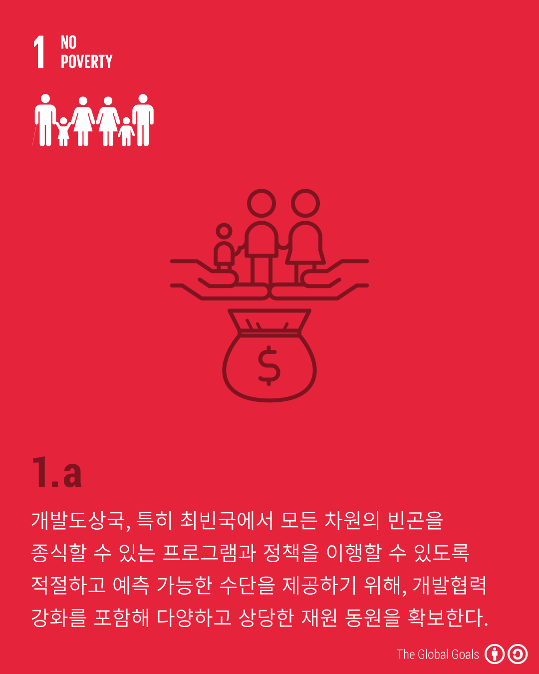 - 1.a - 개발도상국, 특히 최빈국에서 모든 차원의 빈곤을 종식할 수 있는 프로그램과 정책을 이행할 수 있도록 적절하고 예측 가능한 수단을 제공하기 위해, 개발협력 강화를 포함해 다양하고 상당한 재원 동원을 확보한다.