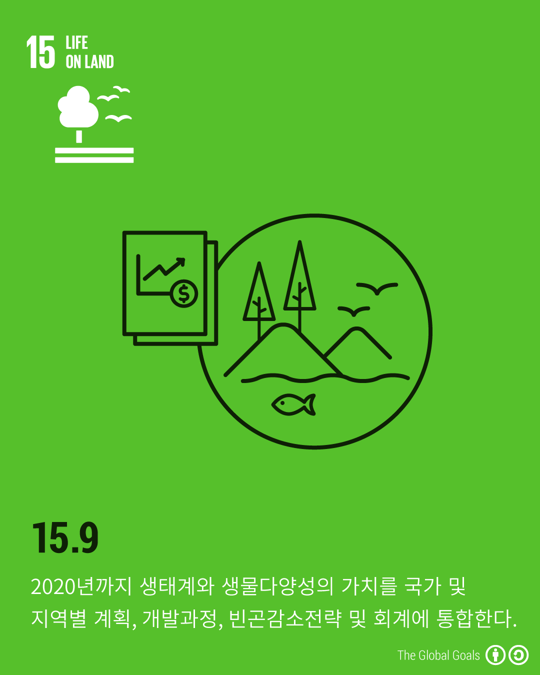 - 15.9 - 2020년까지 생태계와 생물다양성의 가치를 국가 및 지역별 계획, 개발과정, 빈곤감소전략 및 회계에 통합한다.