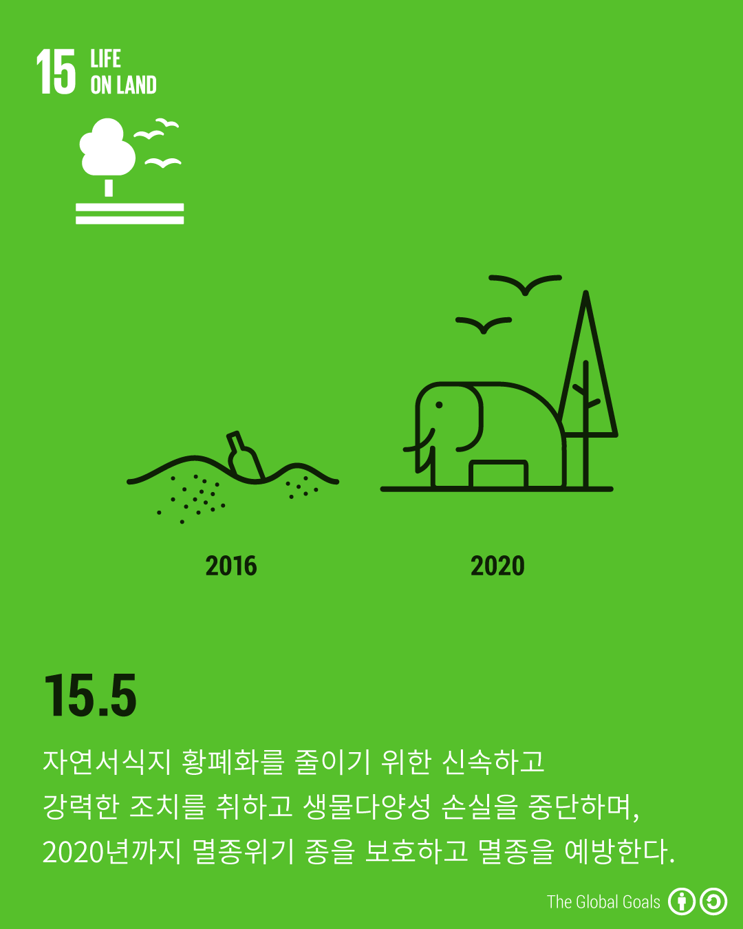 - 15.5 - 자연서식지 황폐화를 줄이기 위한 신속하고 강력한 조치를 취하고 생물다양성 손실을 중단하며, 2020년까지 멸종위기 종을 보호하고 멸종을 예방한다.