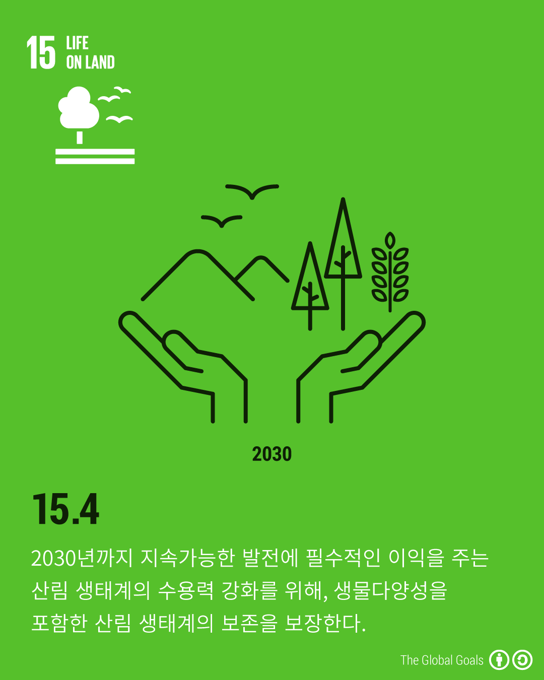 - 15.4 - 2030년까지 지속가능한 발전에 필수적인 이익을 주는 산림 생태계의 수용력 강화를 위해, 생물다양성을 포함한 산림 생태계의 보존을 보장한다.