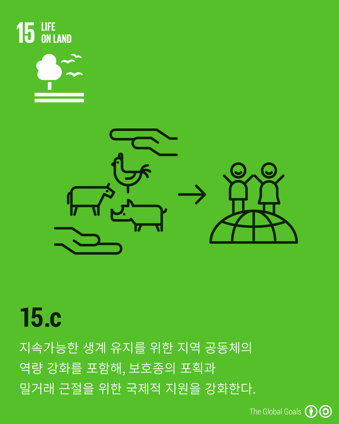- 15.c - 지속가능한 생계 유지를 위한 지역 공동체의 역량 강화를 포함해, 보호종의 포획과 밀거래 근절을 위한 국제적 지원을 강화한다.