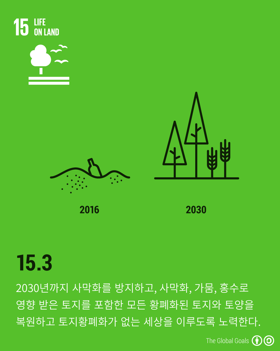 - 15.3 - 2030년까지 사막화를 방지하고, 사막화, 가뭄, 홍수로 영향 받은 토지를 포함한 모든 황폐화된 토지와 토양을 복원하고 토지황폐화가 없는 세상을 이루도록 노력한다.