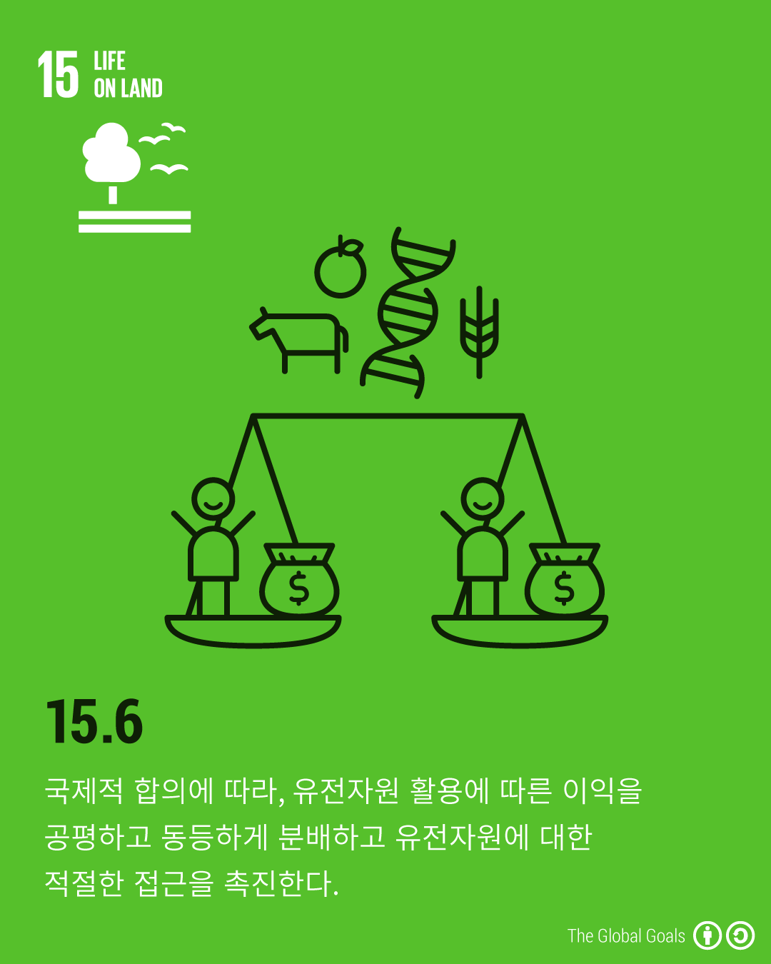 - 15.6 - 국제적 합의에 따라, 유전자원 활용에 따른 이익을 공평하고 동등하게 분배하고 유전자원에 대한 적절한 접근을 촉진한다.