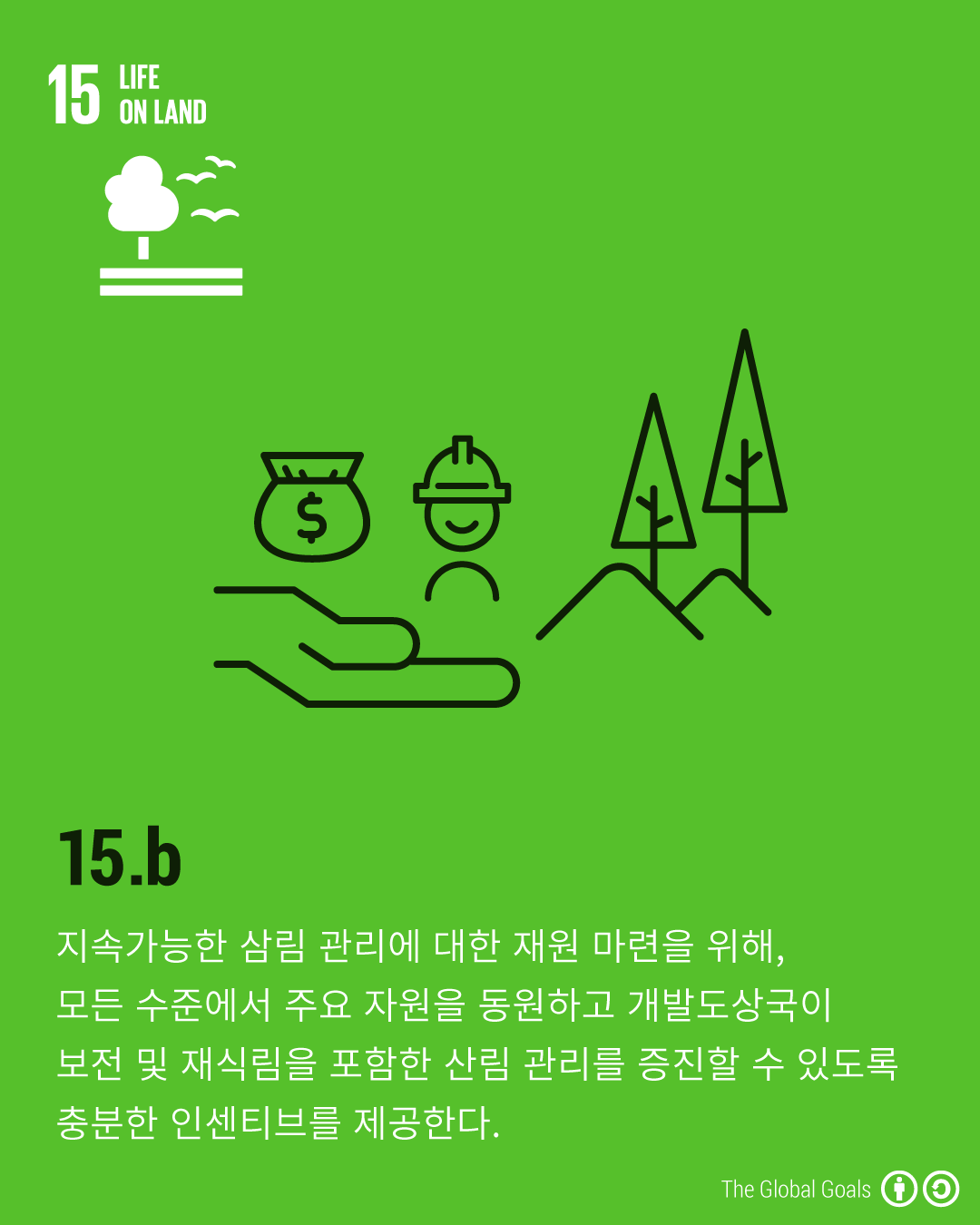 - 15.b - 지속가능한 삼림 관리에 대한 재원 마련을 위해, 모든 수준에서 주요 자원을 동원하고 개발도상국이 보전 및 재식림을 포함한 산림 관리를 증진할 수 있도록 충분한 인센티브를 제공한다.