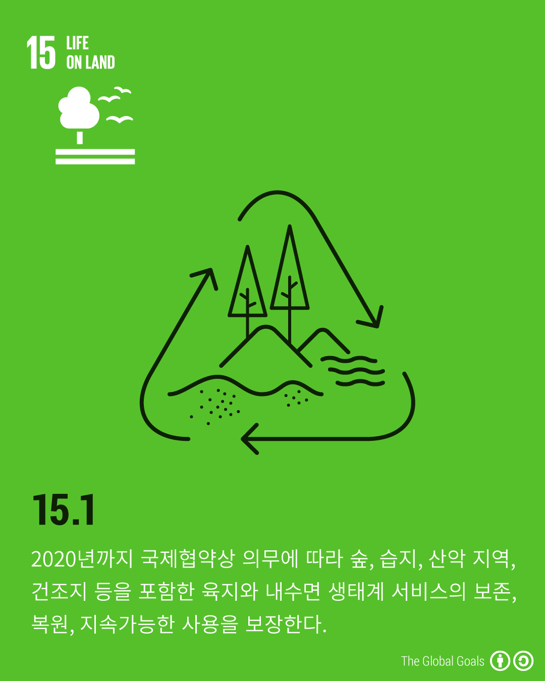 - 15.1 - 2020년까지 국제협약상 의무에 따라 숲, 습지, 산악 지역, 건조지 등을 포함한 육지와 내수면 생태계 서비스의 보존, 복원, 지속가능한 사용을 보장한다.