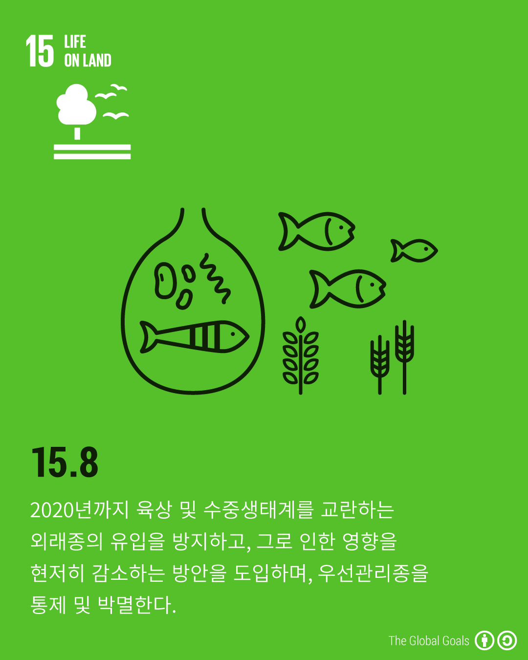 - 15.8 - 2020년까지 육상 및 수중생태계를 교란하는 외래종의 유입을 방지하고, 그로 인한 영향을 현저히 감소하는 방안을 도입하며, 우선관리종을 통제 및 박멸한다.