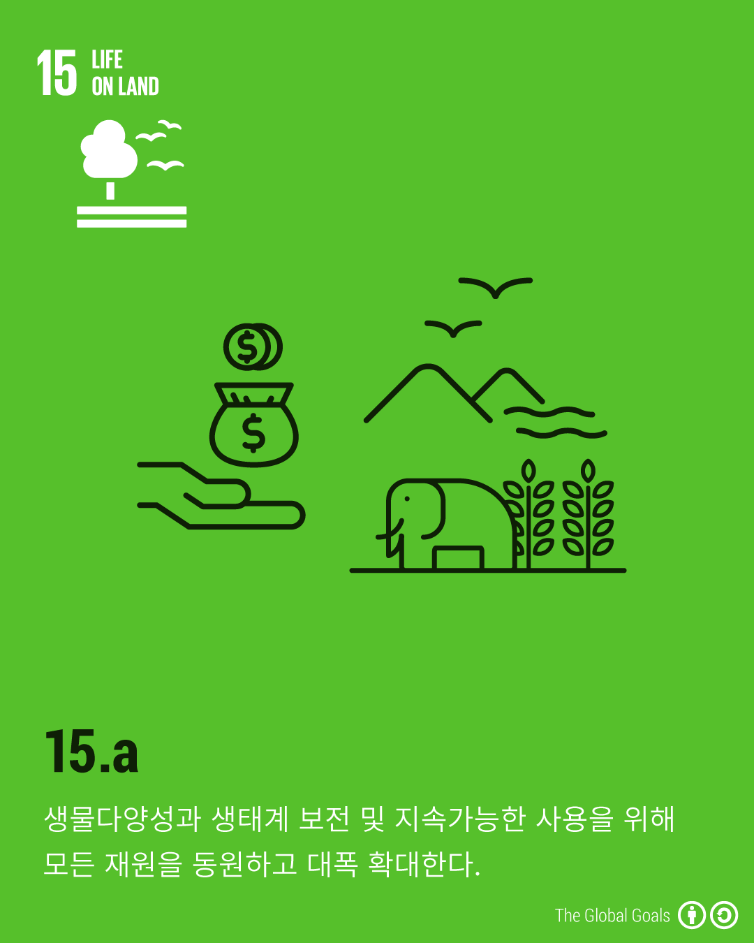 - 15.a - 생물다양성과 생태계 보전 및 지속가능한 사용을 위해 모든 재원을 동원하고 대폭 확대한다.
