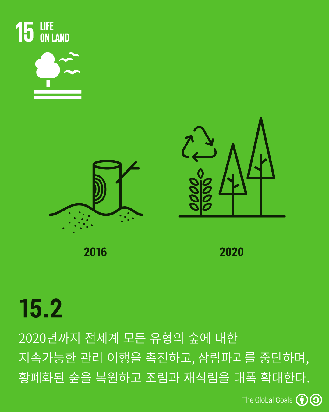 - 15.2 - 2020년까지 전세계 모든 유형의 숲에 대한 지속가능한 관리 이행을 촉진하고, 삼림파괴를 중단하며, 황폐화된 숲을 복원하고 조림과 재식림을 대폭 확대한다.