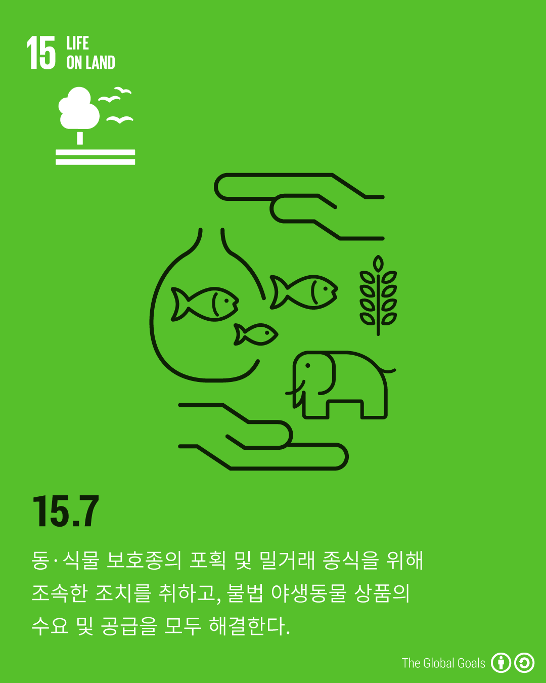 - 15.7 - 동·식물 보호종의 포획 및 밀거래 종식을 위해 조속한 조치를 취하고, 불법 야생동물 상품의 수요 및 공급을 모두 해결한다.