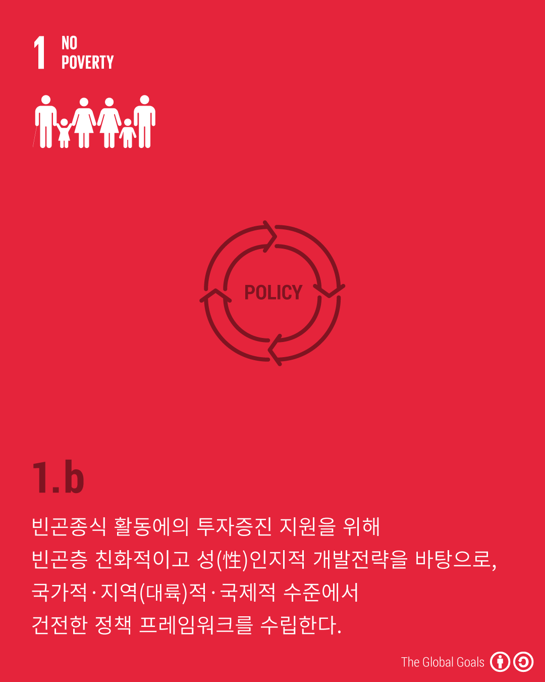- 1.b - 빈곤종식 활동에의 투자증진 지원을 위해 빈곤층 친화적이고 성(性)인지적 개발전략을 바탕으로, '국가적·지역(대륙)적·국제적 수준에서 건전한 정책 프레임워크를 수립한다.