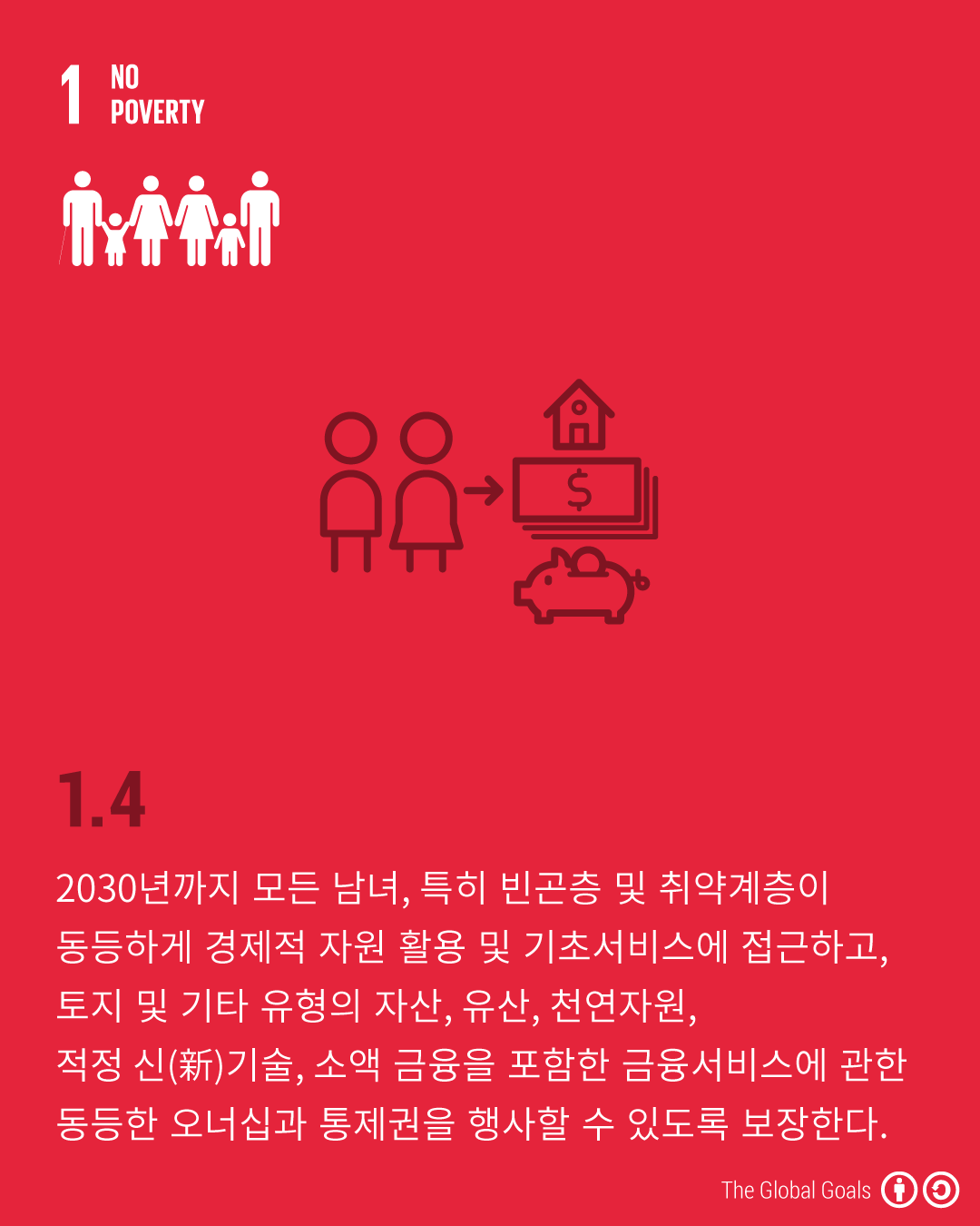 - 1.4 - 2030년까지 모든 남녀, 특히 빈곤층 및 취약계층이 동등하게 경제적 자원 활용 및 기초서비스에 접근하고, 토지 및 기타 유형의 자산, 유산, 천연자원, 적정 신(新)기술, 소액 금융을 포함한 금융서비스에 관한 동등한 오너십과 통제권을 행사할 수 있도록 보장한다.