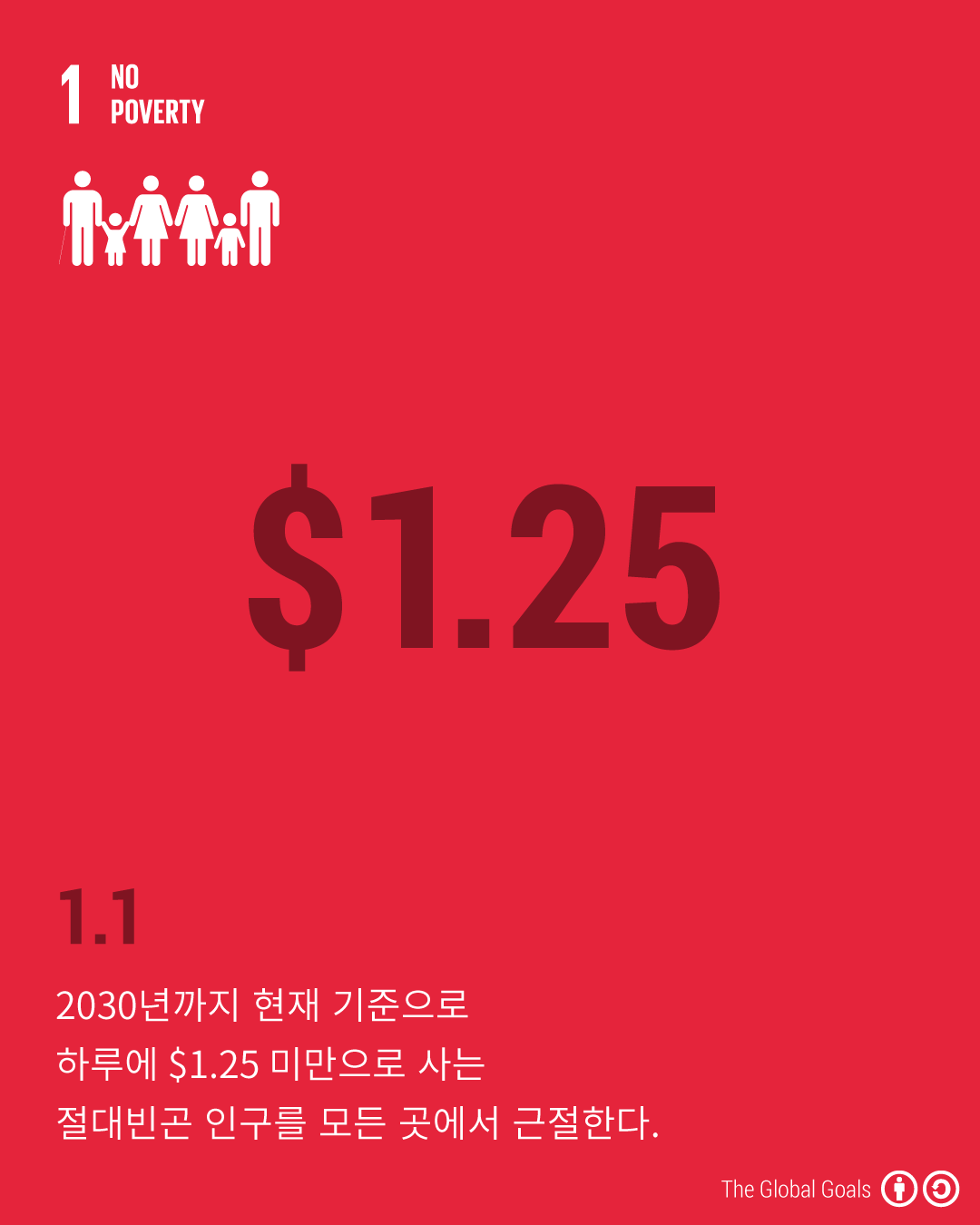 - 1.1 - 2030년까지 현재 기준으로 하루에 $1.25 미만으로 사는 절대빈곤 인구를 모든 곳에서 근절한다.