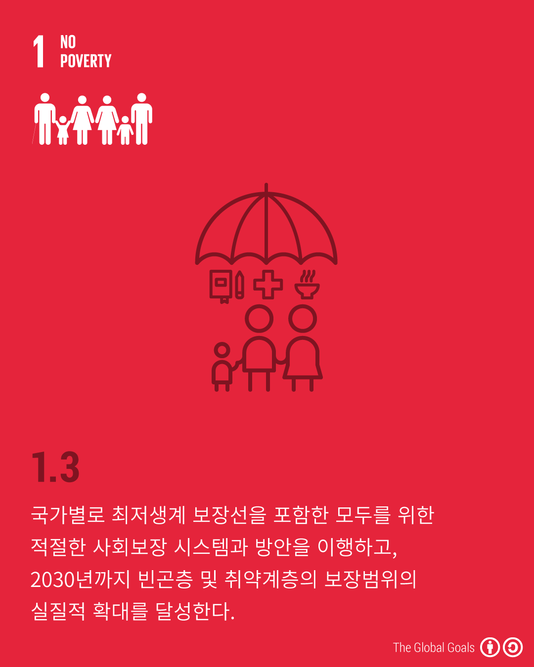 - 1.3 - 국가별로 최저생계 보장선을 포함한 모두를 위한 적잘한 사회보장 시스템과 방안을 이행하고, 2030년까지 빈곤층 및 취약계층의 보장범위의 실질적 확대를 달성한다.