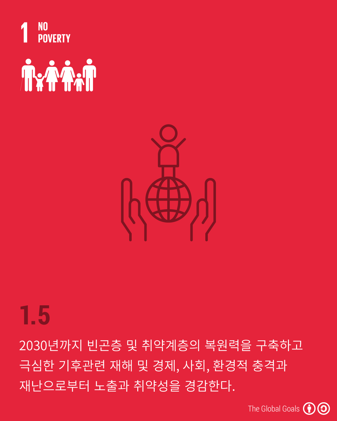 - 1.5 - 2030년까지 빈곤층 및 취약계층의 복원력을 구축하고 극심한 기후관련 재해 및 경제, 사회, 환경적 충격과 재난으로부터 노출과 취약성을 경감한다.