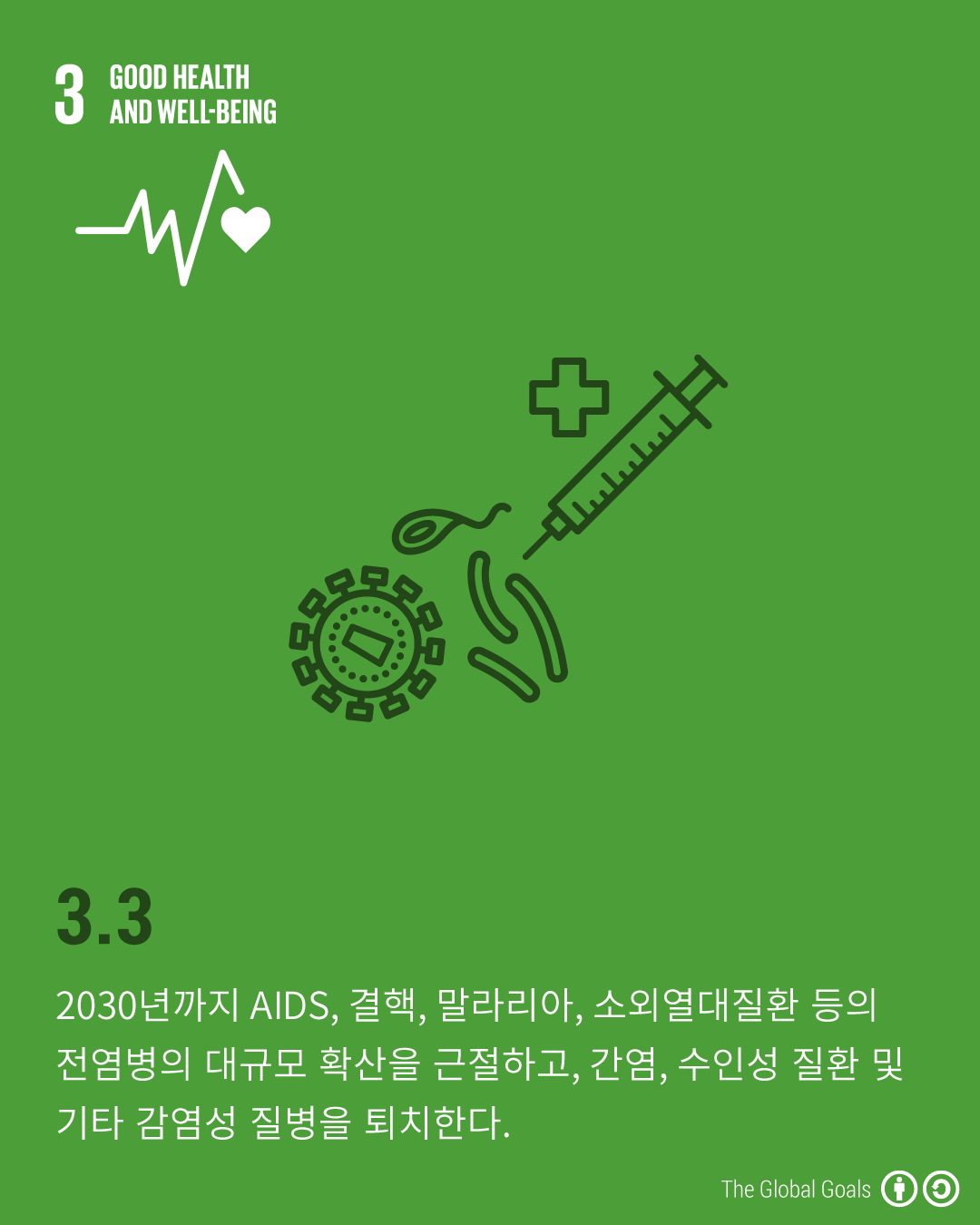 - 3.3 - 2030년까지 AIDS, 결핵, 말라리아, 소외열대질환 등의 전염병의 대규모 확산을 근절하고, 간염, 수인성 질환 및 기타 감염성 질병을 퇴치한다.