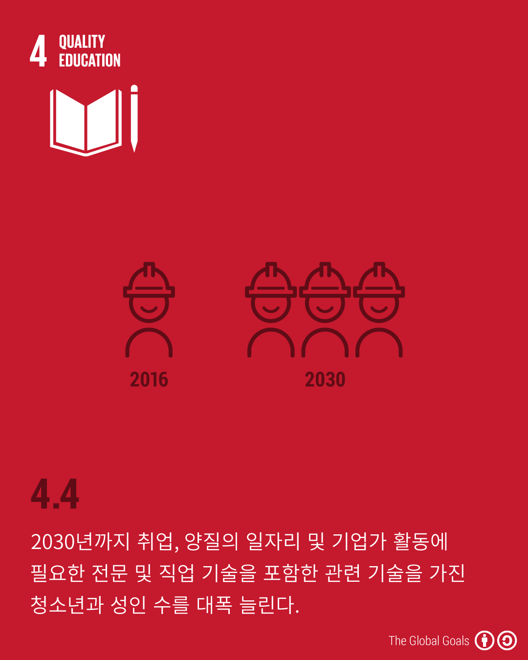 - 4.4 - 2030년까지 취업, 양질의 일자리 및 기업가 활동에 '필요한 전문 및 직업 기술을 포함한 관련 기술을 가진 청소년과 성인 수를 대폭 늘린다.
