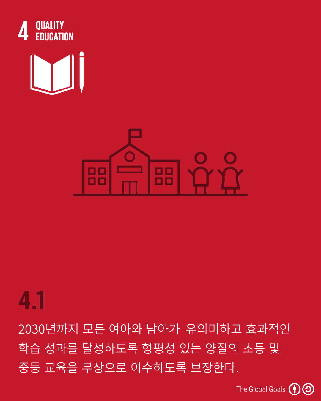 - 4.1 - 2030년까지 모든 여아와 남아가 유의미하고 효과적인 학습 성과를 달성하도록 형평성 있는 양질의 초등 및 중등 교육을 무상으로 이수하도록 보장한다.