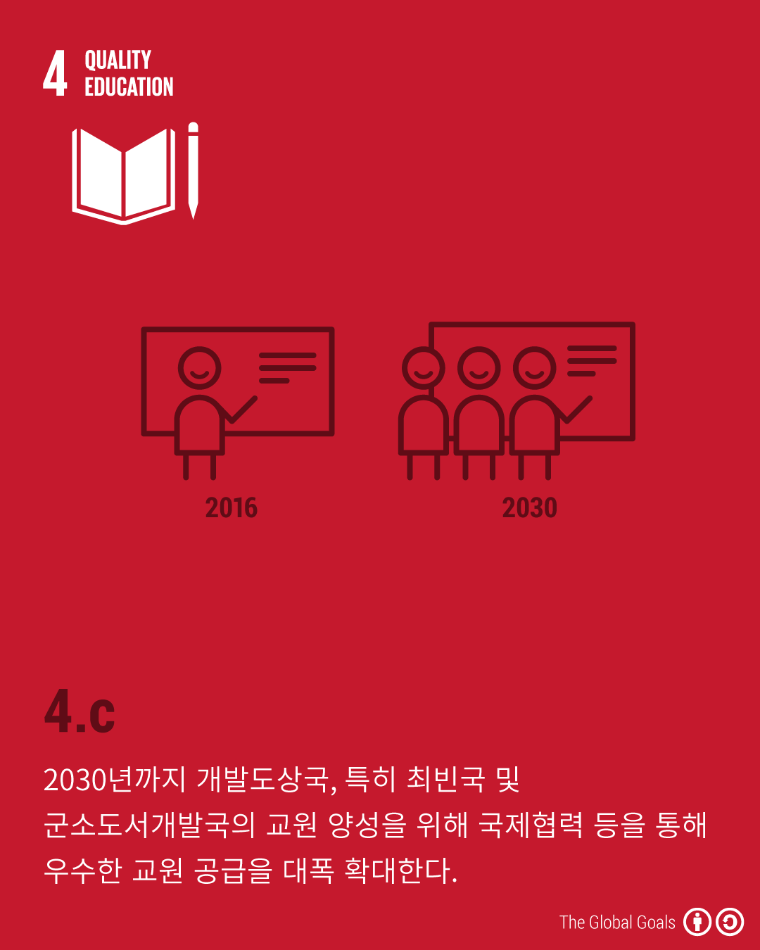 - 4.c - 2030년까지 개발도상국, 특히 최빈국 및 군소도서개발국의 교원 양성을 위해 국제협력 등을 통해 우수한 교원 공급을 대폭 확대한다.