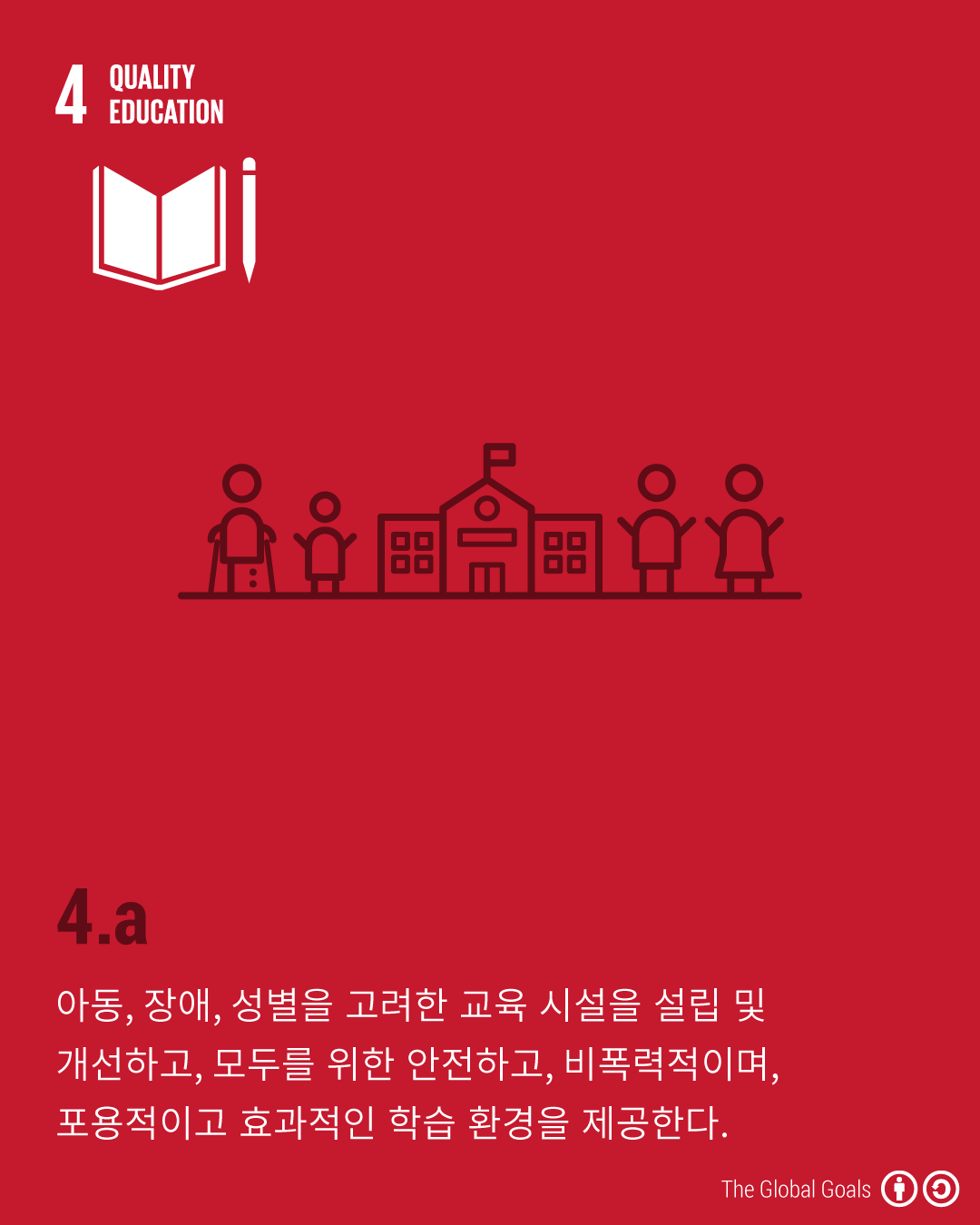 - 4.a - 아동, 장애, 성별을 고려한 교육 시설을 설립 및 개선하고, 모두를 위한 안전하고, 비폭력적이며, 포용적이고 효과적인 학습 환경을 제공한다.