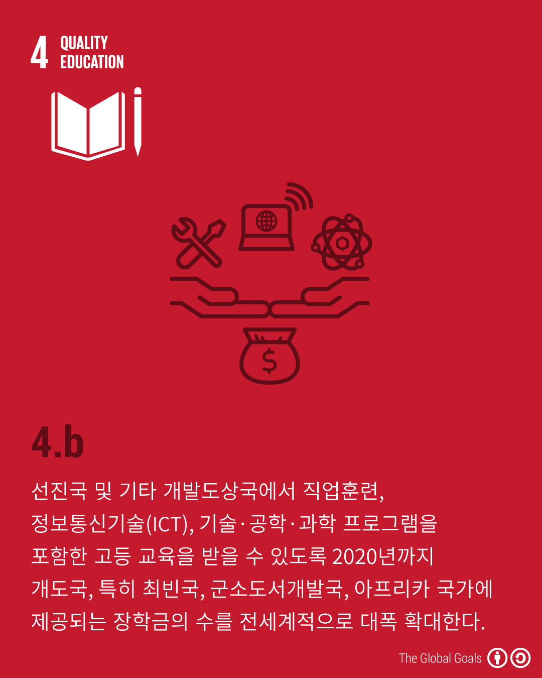 - 4.b - 선진국 및 기타 개발도상국에서 직업훈련, 정보통신기술(ICT), 기술·공학·과학 프로그램을 포함한 고등 교육을 받을 수 있도록 2020년까지 개도국, 특히 최빈국, 군소도서개발국, 아프리카 국가에 제공되는 장학금의 수를 전세계적으로 대폭 확대한다.