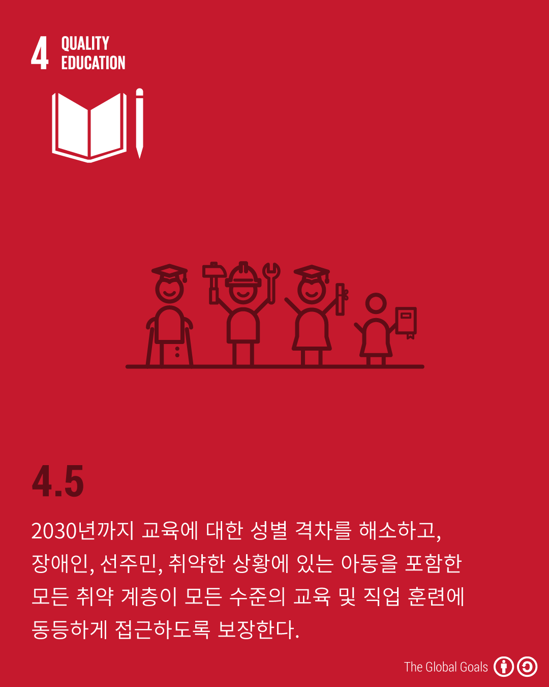 - 4.5 - 2030년까지 교육에 대한 성별 격차를 해소하고, '장애인, 선주민, 취약한 상황에 있는 아동을 포함한 모든 취약 계층이 모든 수준의 교육 및 직업 훈련에 '동등하게 접근하도록 보장한다.