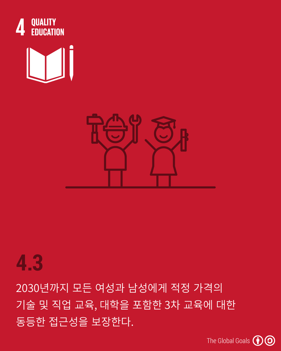 - 4.3 - 2030년까지 모든 여성과 남성에게 적정 가격의 기술 및 직업 교육, 대학을 포함한 3차 교육에 대한 동등한 접근성을 보장한다.