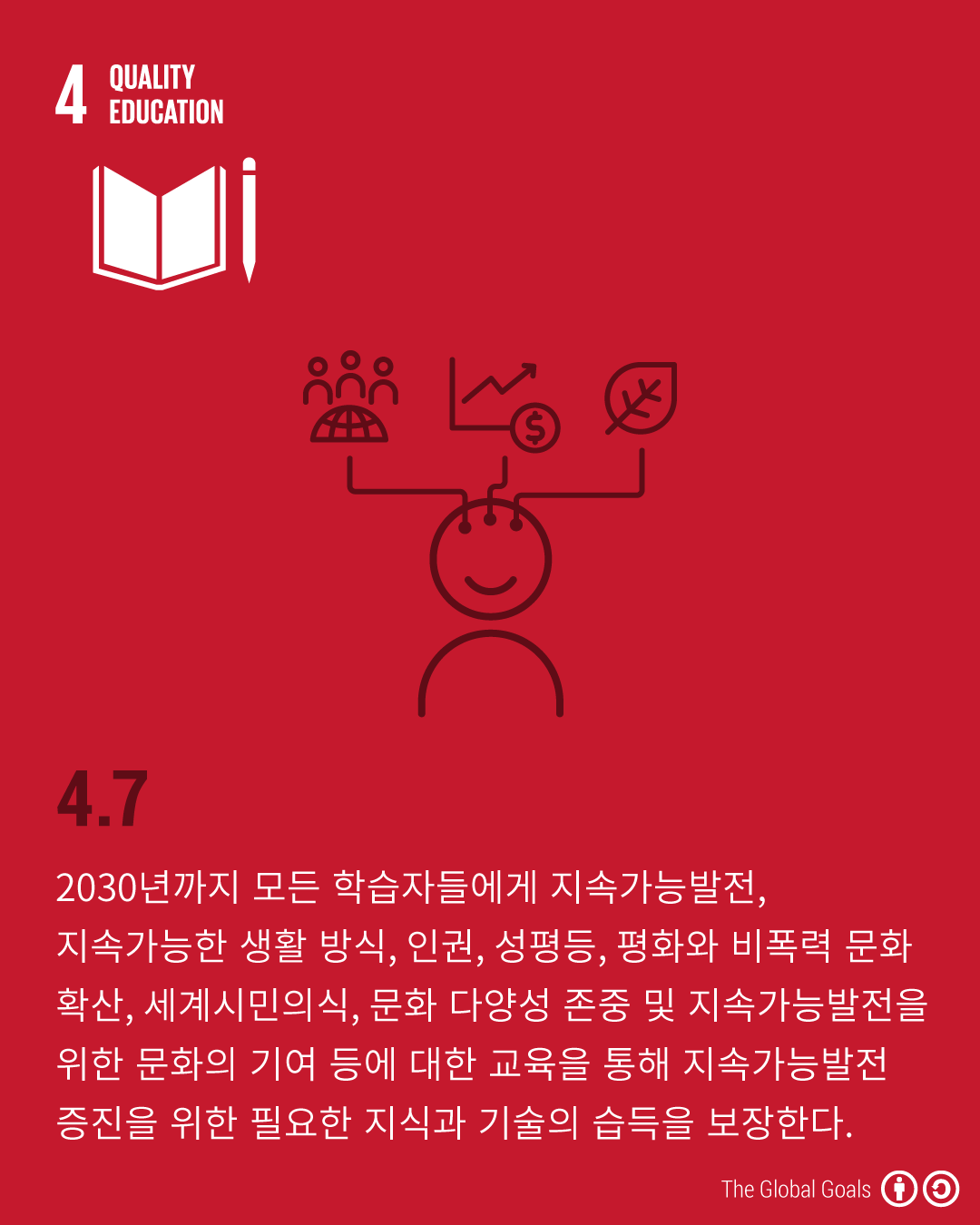 - 4.7 - 2030년까지 모든 학습자들에게 지속가능발전, 지속가능한 생활 방식, 인권, 성평등, 평화와 비폭력 문화 확산, 세계시민의식, 문화 다양성 존중 및 지속가능발전을 위한 문화의 기여 등에 대한 교육을 통해 지속가능발전 증진을 위한 필요한 지식과 기술의 습득을 보장한다.