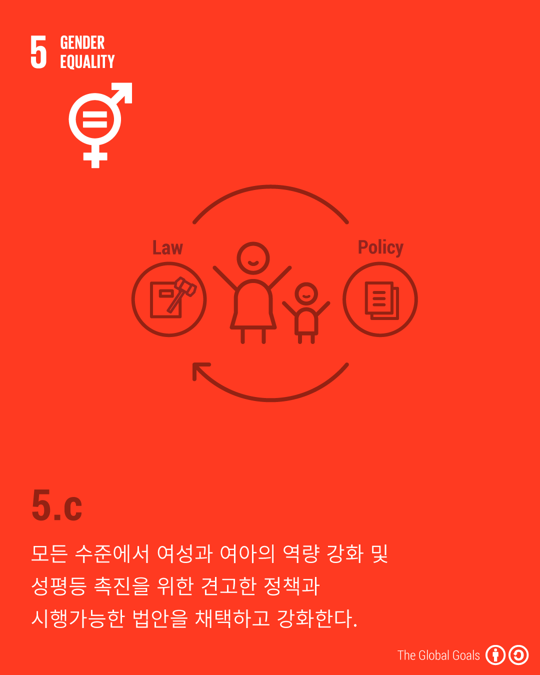 - 5.c - 모든 수준에서 여성과 여아의 역량 강화 및 성평등 촉진을 위한 견고한 정책과 시행가능한 법안을 채택하고 강화한다.