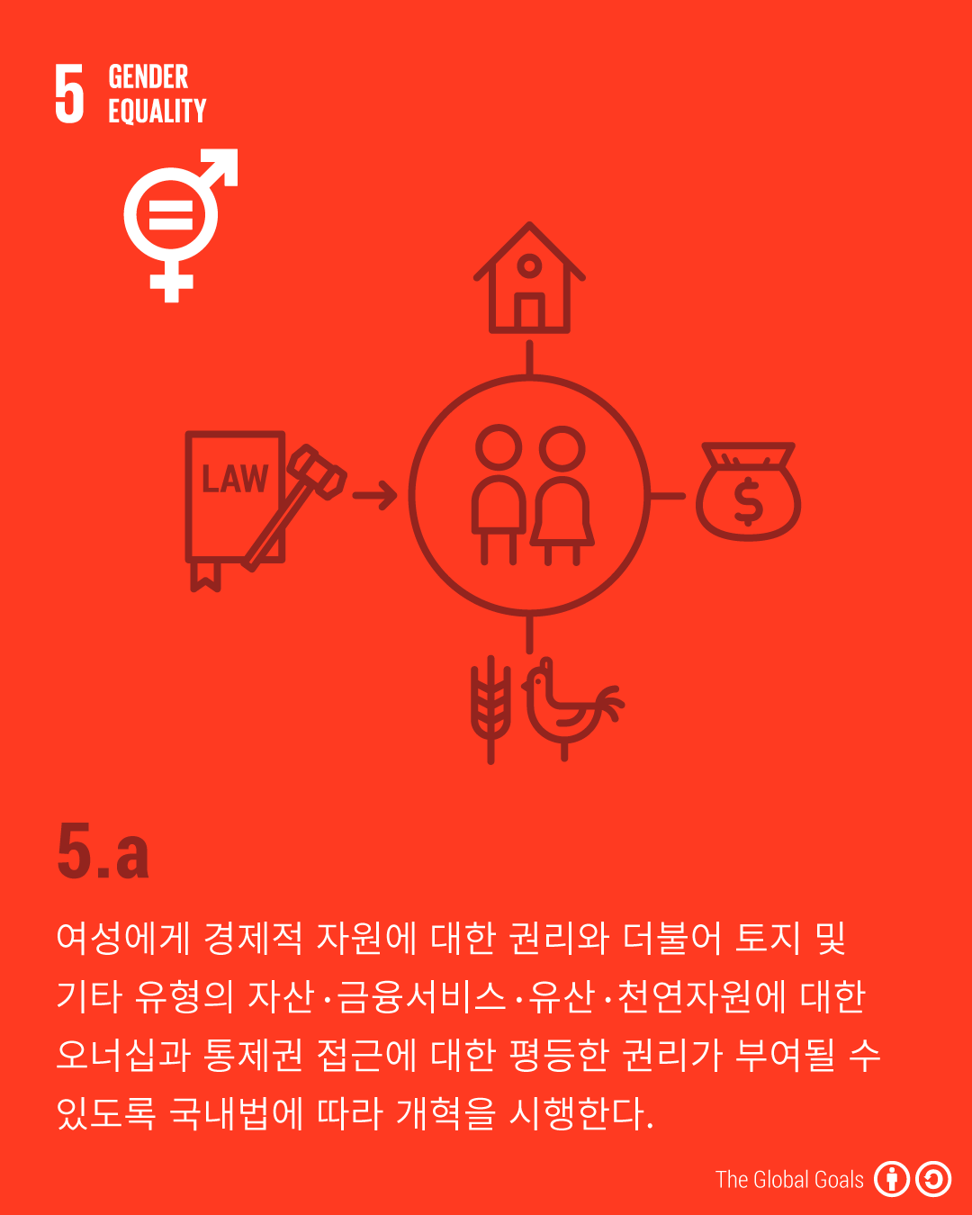 - 5.a - 여성에게 경제적 자원에 대한 권리와 더불어 토지 및 기타 유형의 자산·금융서비스 · 유산 · 천연자원에 대한 오너십과 통제권 접근에 대한 평등한 권리가 부여될 수 있도록 국내법에 따라 개혁을 시행한다.