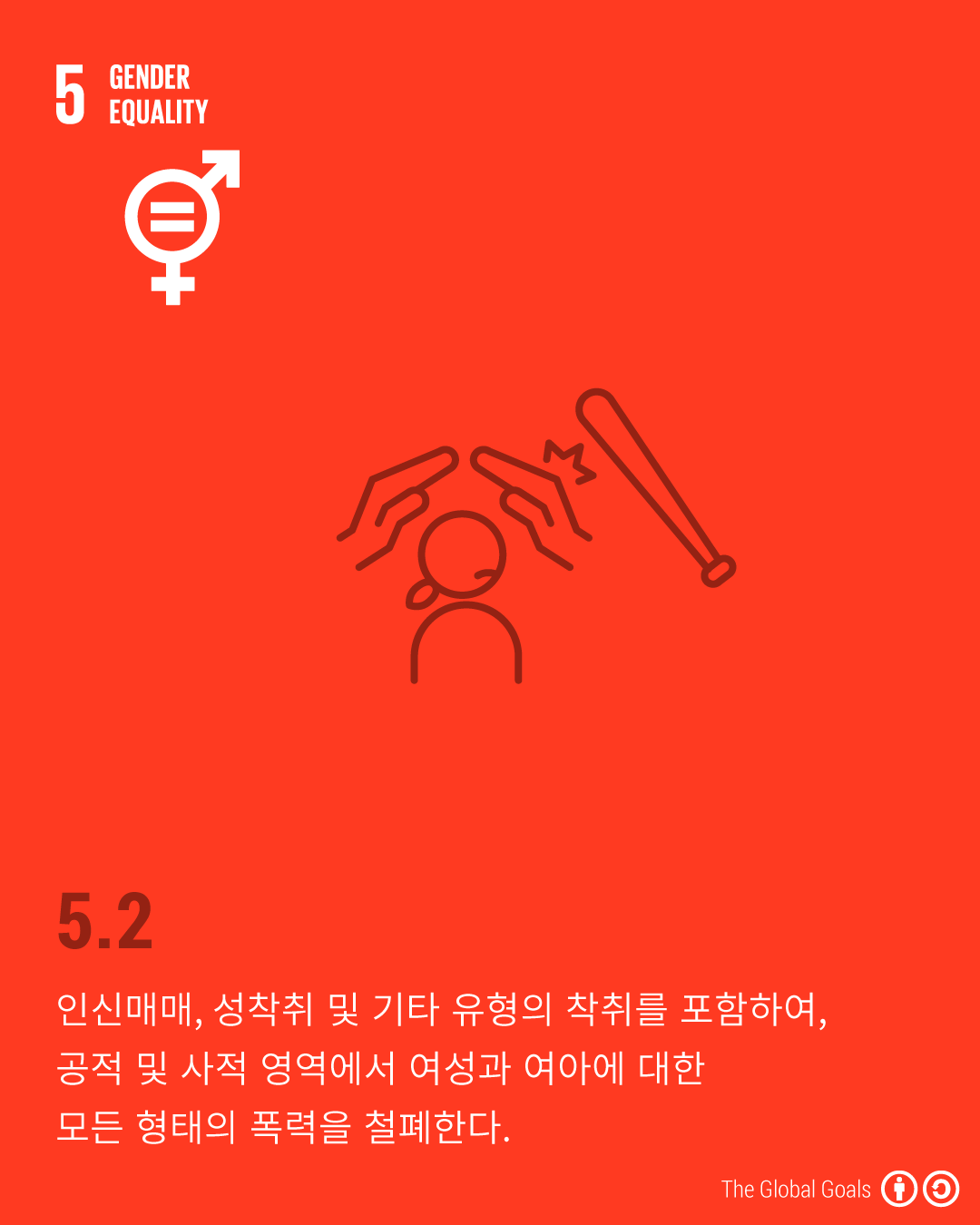 - 5.2 - 인신매매, 성착취 및 기타 유형의 착취를 포함하여, 공적 및 사적 영역에서 여성과 여아에 대한 모든 형태의 폭력을 철폐한다.