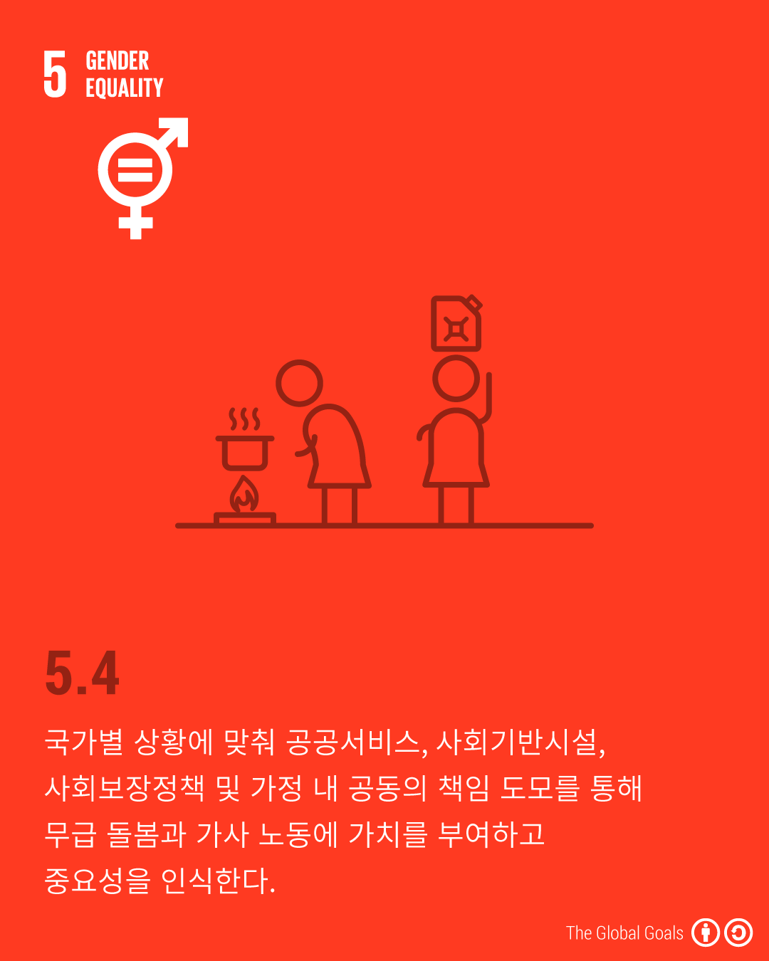 - 5.4 - 국가별 상황에 맞춰 공공서비스, 사회기반시설, 사회보장정책 및 가정 내 공동의 책임 도모를 통해 무급 돌봄과 가사 노동에 가치를 부여하고 중요성을 인식한다.