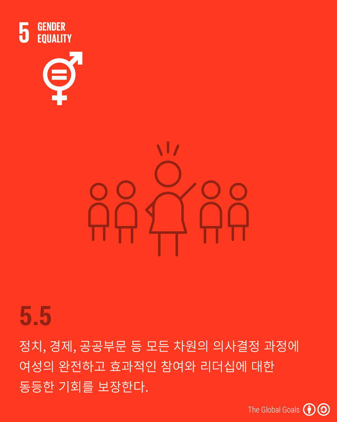 - 5.5 - 정치, 경제, 공공부문 등 모든 차원의 의사결정 과정에 여성의 완전하고 효과적인 참여와 리더십에 대한 동등한 기회를 보장한다.