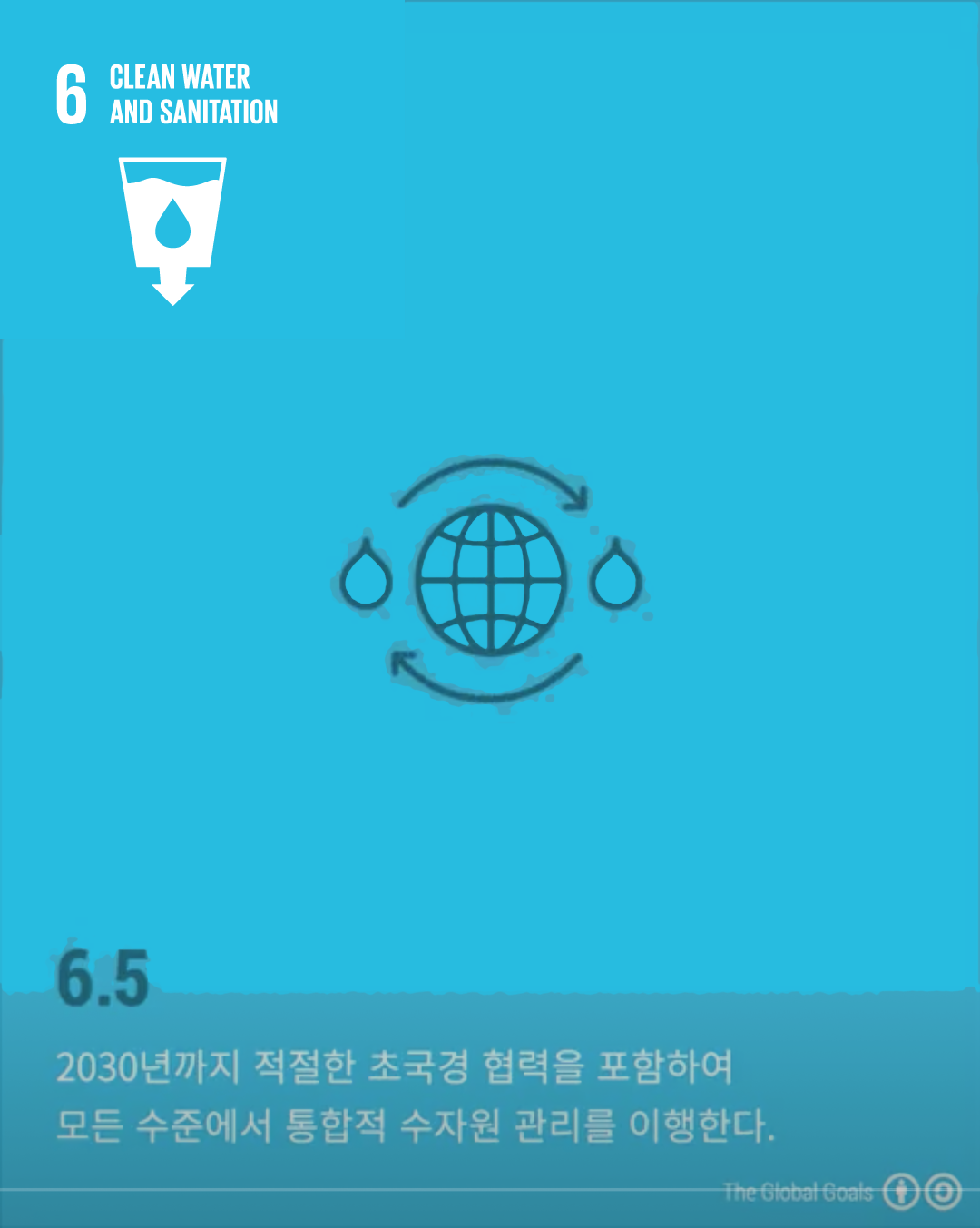 - 6.5 - 2030년까지 적절한 초국경 협력을 포함하여 모든 수준에서 통합적 수자원 관리를 이행한다.