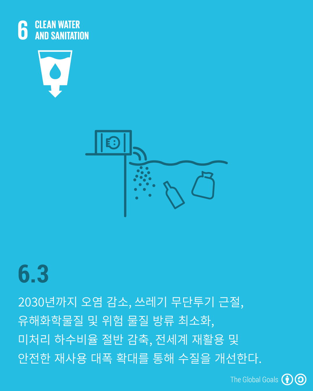- 6.3 - 2030년까지 오염 감소, 쓰레기 무단투기 근절, 유해화학물질 및 위험 물질 방류 최소화, 미처리 하수비율 절반 감축, 전세계 재활용 및 안전한 재사용 대폭 확대를 통해 수질을 개선한다.