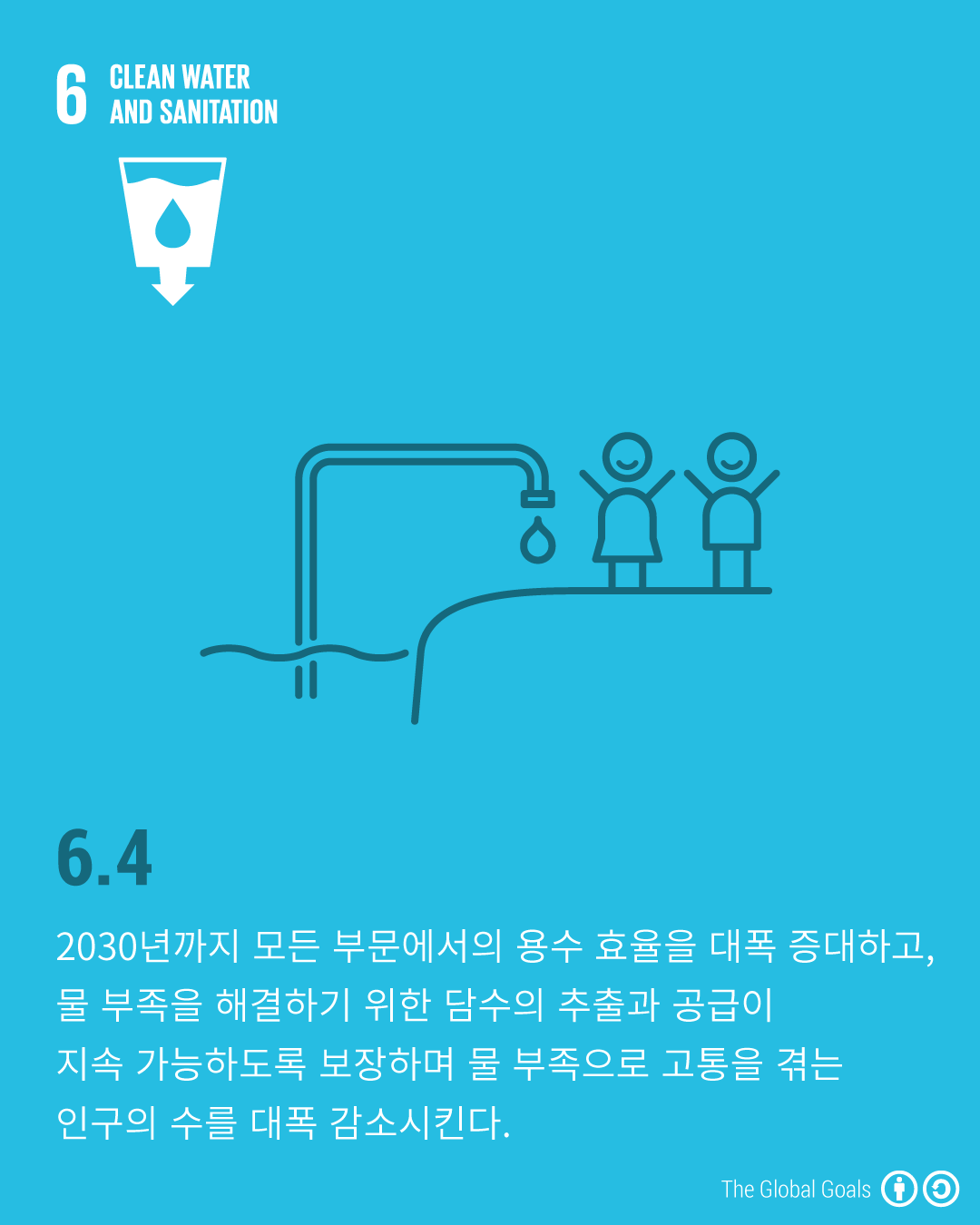 - 6.4 - 2030년까지 모든 부문에서의 용수 효율을 대폭 증대하고, 물 부족을 해결하기 위한 담수의 추출과 공급이 지속 가능하도록 보장하며 물 부족으로 고통을 겪는 인구의 수를 대폭 감소시킨다.