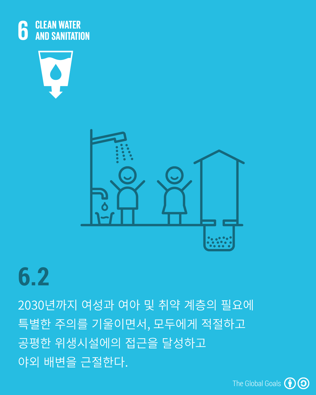 - 6.2 - 2030년까지 여성과 여아 및 취약 계층의 필요에 특별한 주의를 기울이면서, 모두에게 적절하고 공평한 위생시설에의 접근을 달성하고 야외 배변을 근절한다.