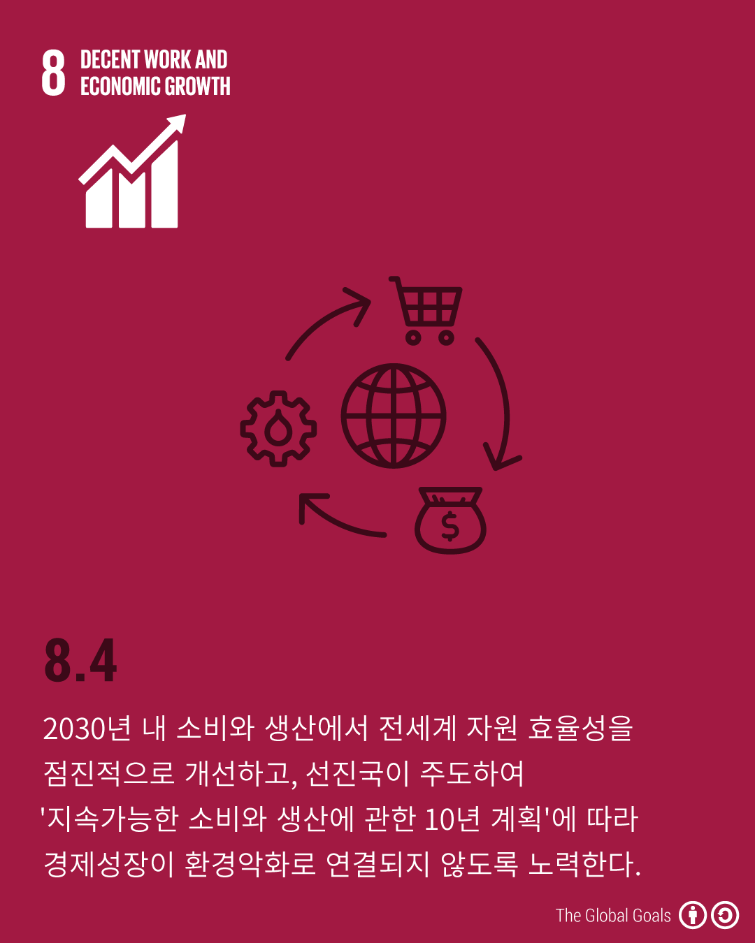 - 8.4 - 2030년 내 소비와 생산에서 전세계 자원 효율성을 점진적으로 개선하고, 선진국이 주도하여 '지속가능한 소비와 생산에 관한 10년 계획'에 따라 경제성장이 환경악화로 연결되지 않도록 노력한다.