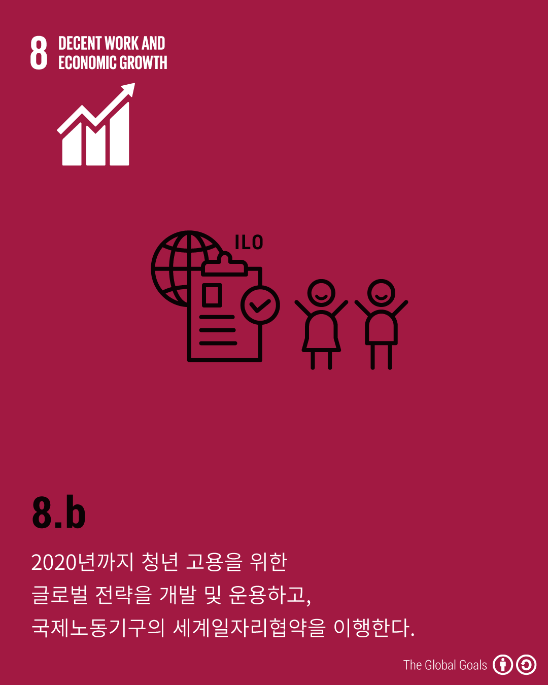 - 8.b - 2020년까지 청년 고용을 위한 글로벌 전략을 개발 및 운용하고, 국제노동기구의 세계일자리협약을 이행한다.