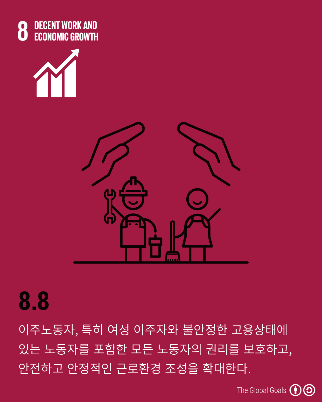 - 8.8 - 이주노동자, 특히 여성 이주자와 불안정한 고용상태에 있는 노동자를 포함한 모든 노동자의 권리를 보호하고, 안전하고 안정적인 근로환경 조성을 확대한다.