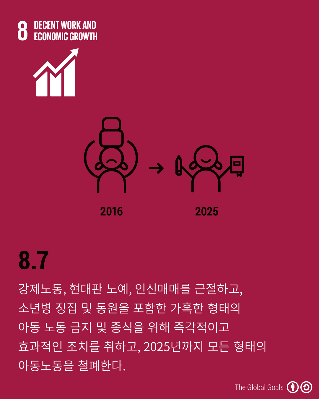 - 8.7 - 강제노동, 현대판 노예, 인신매매를 근절하고, 소년병 징집 및 동원을 포함한 가혹한 형태의 아동 노동 금지 및 종식을 위해 즉각적이고 효과적인 조치를 취하고, 2025년까지 모든 형태의 아동노동을 철폐한다.