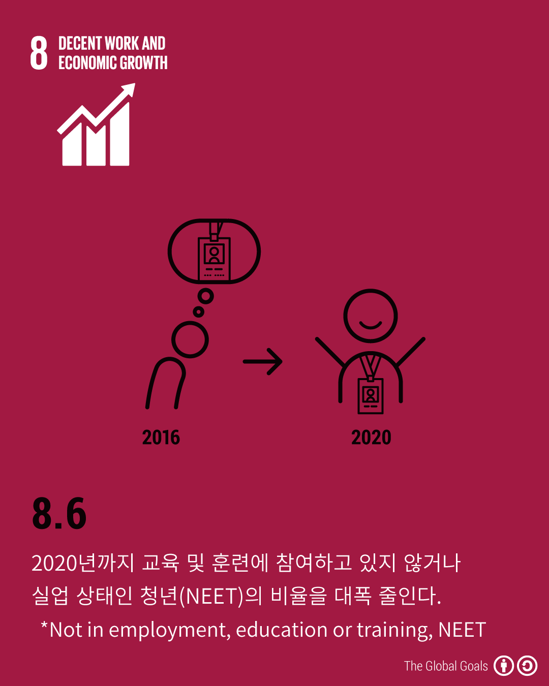 - 8.6 - 2020년까지 교육 및 훈련에 참여하고 있지 않거나 실업 상태인 청년(NEET)의 비율을 대폭 줄인다. *Not in employment, education or training, NEET
