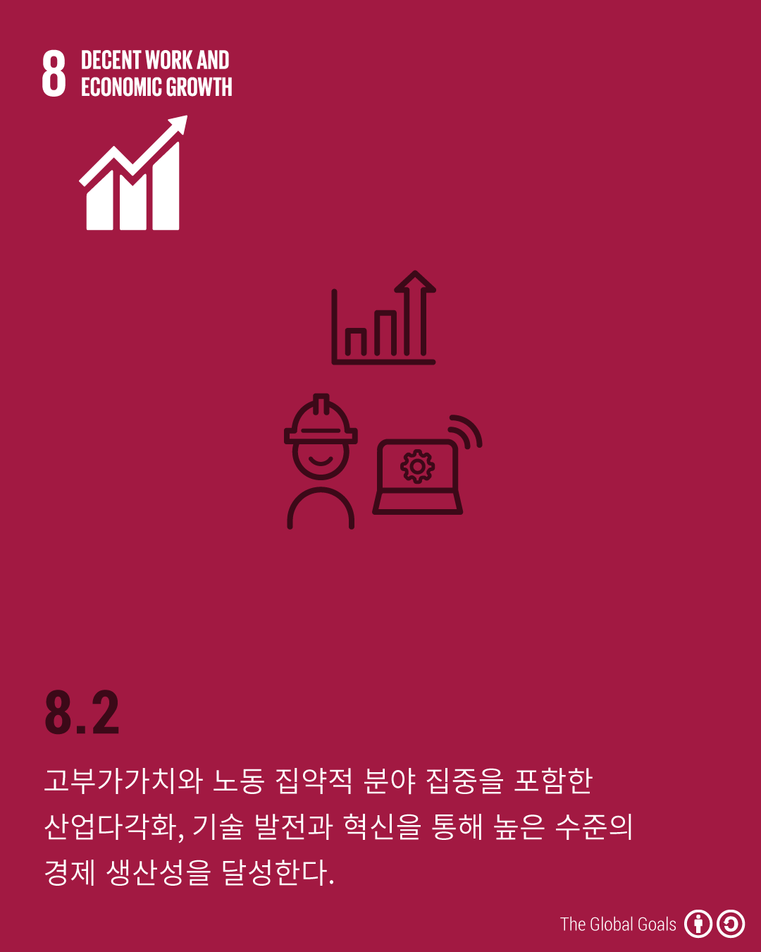 UN-SDGs(지속가능발전목표) 8번은 지속적인 경제성장과 양질의 일자리 증진을 목표로 합니다. 이는 국가별 상황에 맞추어 경제성장을 지속화하고 다양화, 기술 향상 및 혁신을 통해 경제적 생산성을 높이는 것을 목표로 합니다. 또한, 생산적 활동, 기업가 정신, 창조와 혁신을 지원하는 정책을 장려하고, 2030년까지 소비와 생산에서 자원 효율을 획기적으로 개선하기를 기대합니다. 이와 더불어 모든 남녀에 동일 노동에 대한 동일 보수 달성, 모든 형태의 아동 노동 및 강제노동 근절, 안전한 근로환경 조성 및 일자리 창출, 금융 서비스 강화를 위해 노력해야 합니다. 이를 위해 개발도상국, 특히 최빈국을 위해 ‘무역을 위한 원조'에 대한 지원을 확대하고 2020년까지 청년 고용전략을 개발·운용하고 ILO의 '세계 일자리 협약’ 추진을 제안하고 있습니다.