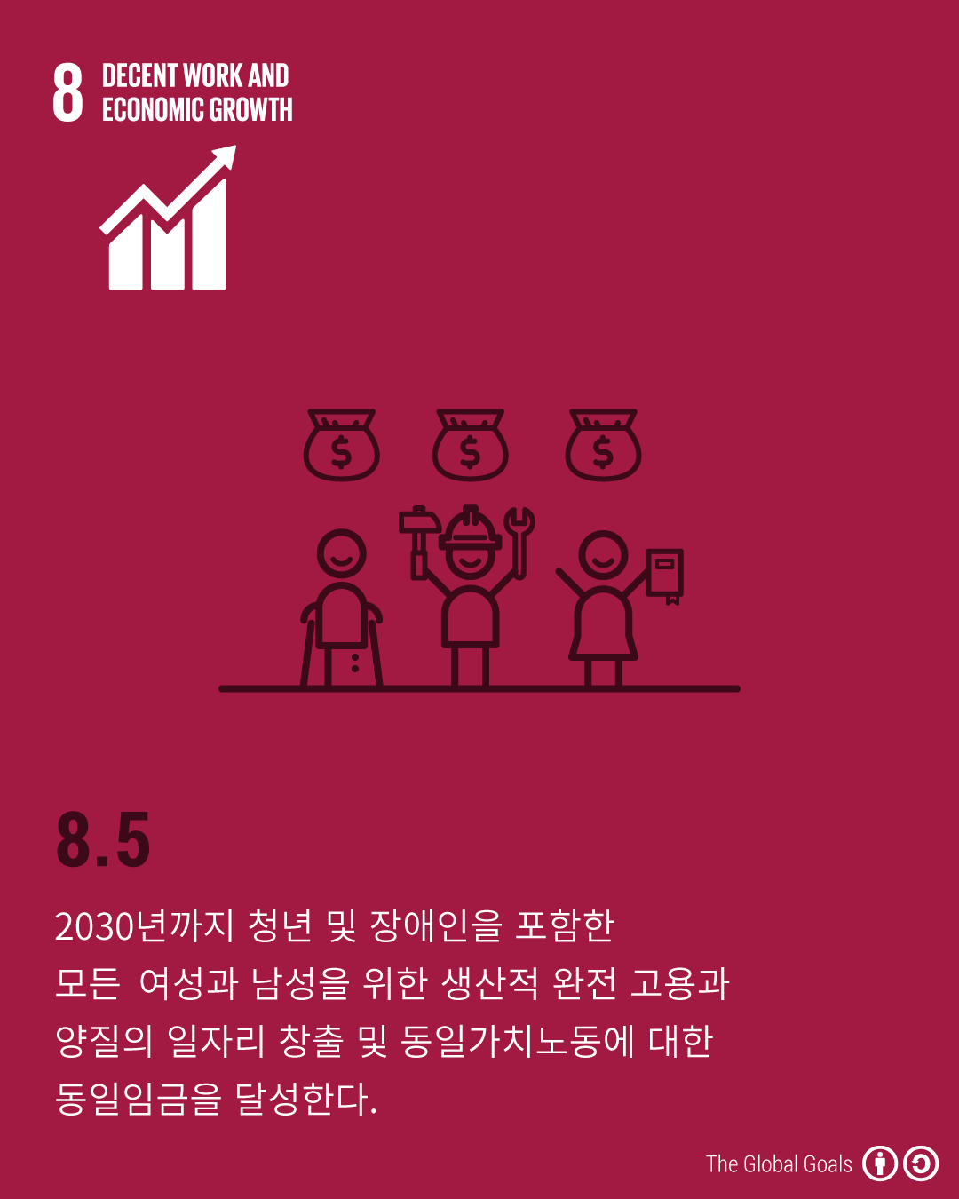 - 8.5 - 2030년까지 청년 및 장애인을 포함한 '모든 여성과 남성을 위한 생산적 완전 고용과 양질의 일자리 창출 및 동일가치노동에 대한 동일임금을 달성한다.