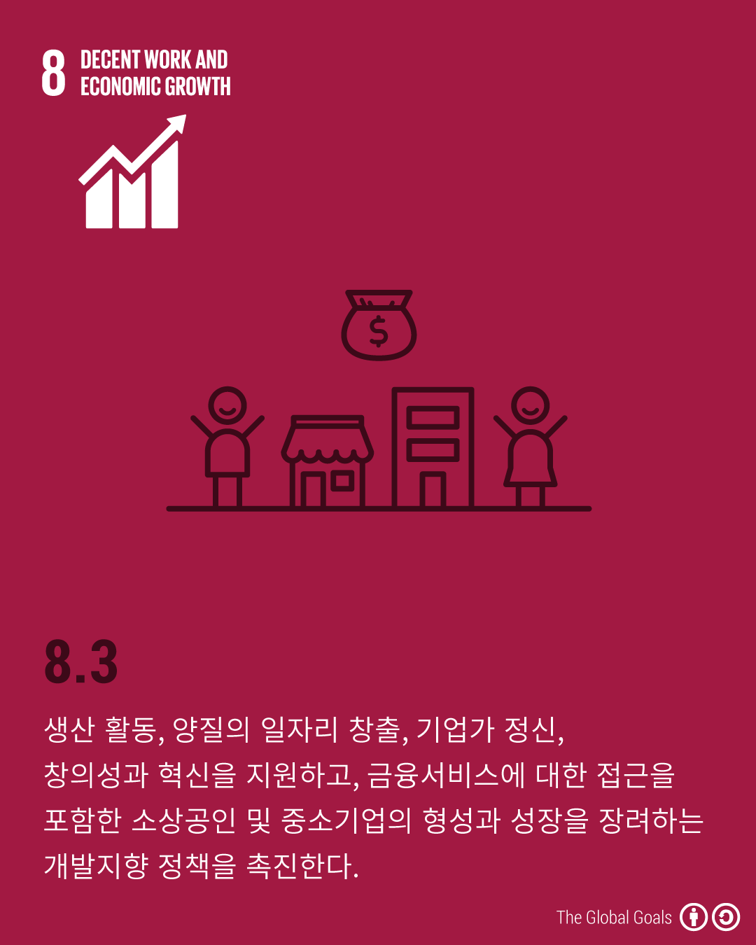 - 8.3 - 생산 활동, 양질의 일자리 창출, 기업가 정신, 창의성과 혁신을 지원하고, 금융서비스에 대한 접근을 포함한 소상공인 및 중소기업의 형성과 성장을 장려하는 '개발지향 정책을 촉진한다.