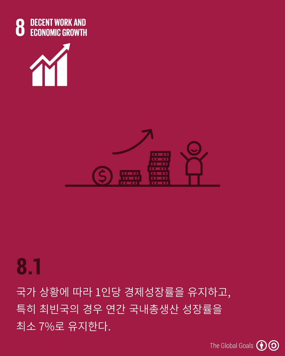 - 8.1 - 국가 상황에 따라 1인당 경제성장률을 유지하고, 특히 최빈국의 경우 연간 국내총생산 성장률을 최소 7%로 유지한다.