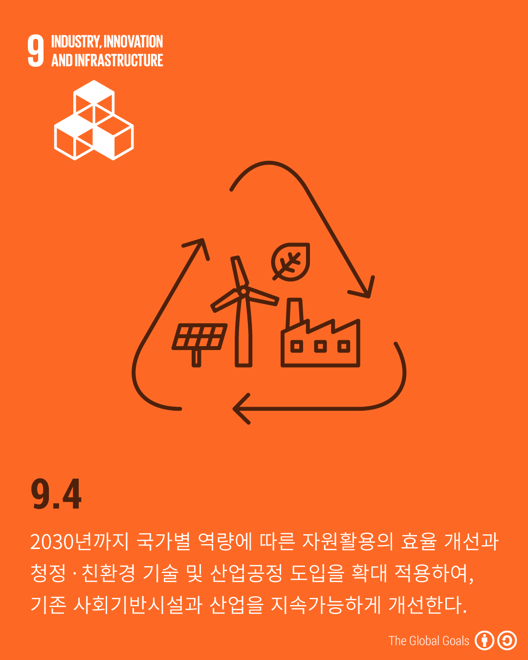 - 9.4 - 2030년까지 국가별 역량에 따른 자원활용의 효율 개선과 청정 · 친환경 기술 및 산업공정 도입을 확대 적용하여, 기존 사회기반시설과 산업을 지속가능하게 개선한다.