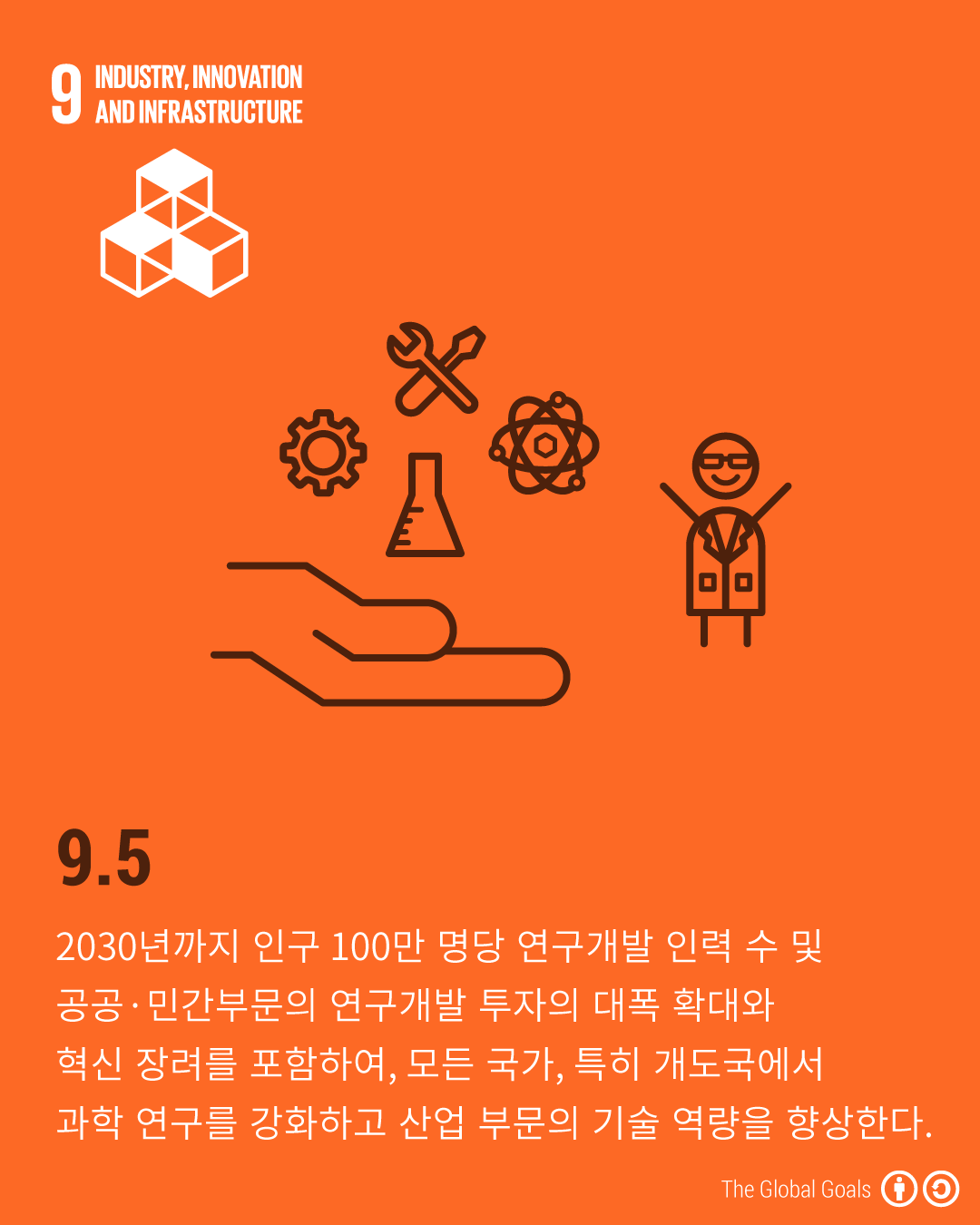 2030년까지 인구 100만 명당 연구개발 인력 수 및 공공·민간부문의 연구개발 투자의 대폭 확대와 혁신 장려를 포함하여, 모든 국가, 특히 개도국에서 과학 연구를 강화하고 산업 부문의 기술 역량을 향상한다.