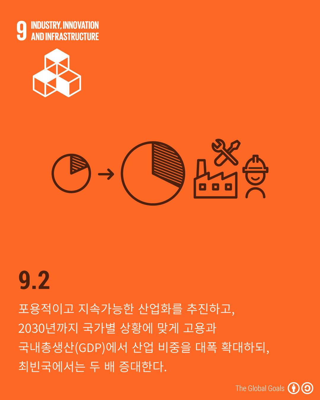 - 9.2 - 포용적이고 지속가능한 산업화를 추진하고, 2030년까지 국가별 상황에 맞게 고용과 국내총생산(GDP)에서 산업 비중을 대폭 확대하되, 최빈국에서는 두 배 증대한다.