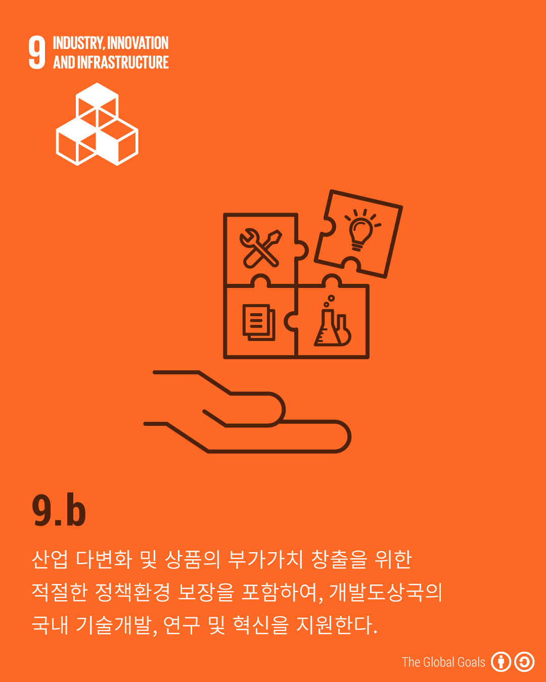 - 9.b - 산업 다변화 및 상품의 부가가치 창출을 위한 적절한 정책환경 보장을 포함하여, 개발도상국의 국내 기술개발, 연구 및 혁신을 지원한다.